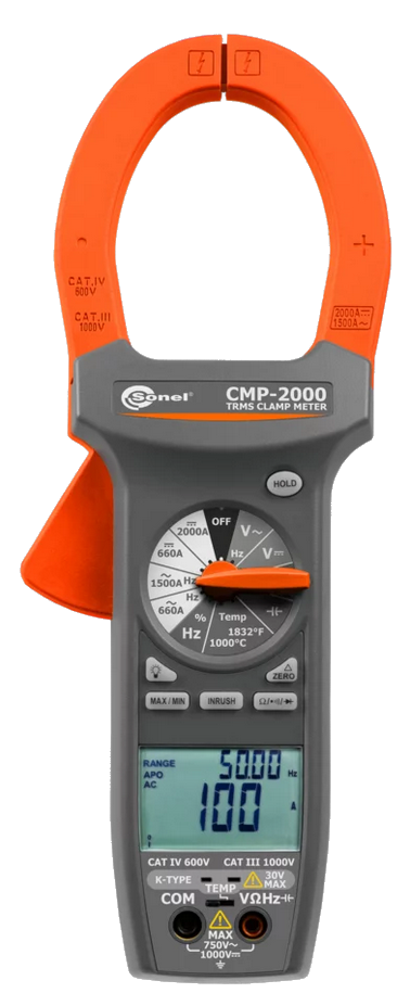Profesjonalny miernik cęgowy Sonel CMP-2000 to wielozadaniowy przyrząd znajdujący zastosowanie przy pomiarze wysokich prądów do 2000 A przy pomocy cęgów na przewodach o średnicy do 57 mm i szyno-przewodach do 70 x 18 mm. Dzięki specjalnej funkcji INRUSH możliwy jest pomiar maksymalnej wartości chwilowej prądu, który pobierany jest przez urządzenie elektryczne podczas jego rozruchu.
