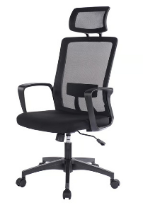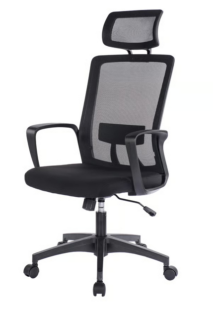 Krzesło obrotowe, na kółkach, z regulacją wysokości. Szkielet z tworzywa, siedzisko obite tkaniną, oparcie z siatki mesh.