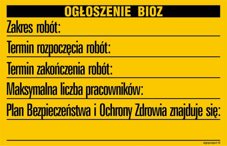 Tablica wykonana na żółtej płycie PVC o grubości 0,6mm.