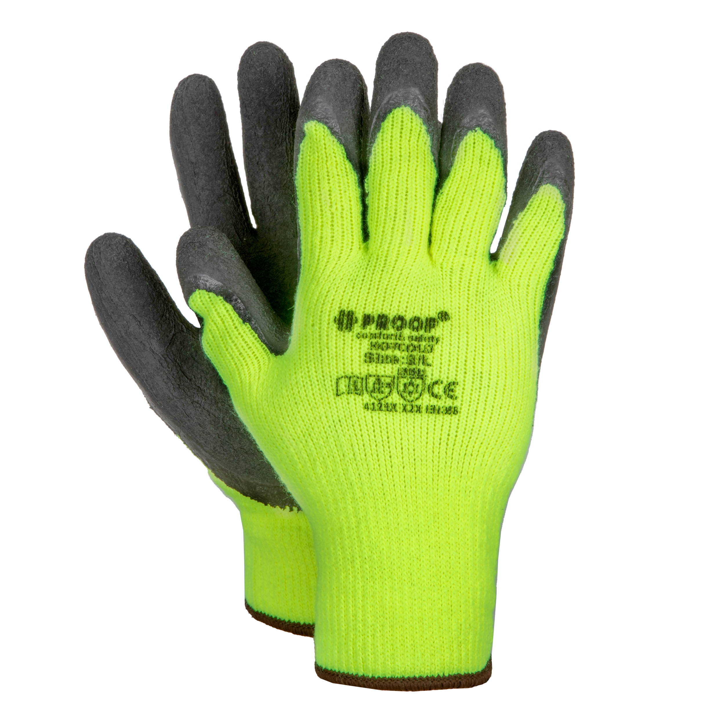 Wkładka poliestrowa jest pokryta mocną czarną powłoką lateksową. Dużą zaletą jest żółty kolor, który zwiększa widoczność podczas prac na zewnątrz. (Szyny kolejowe, lotniska, roboty drogowe…). Gruba podszewka chroni dłonie przez niskimi temperaturami.
